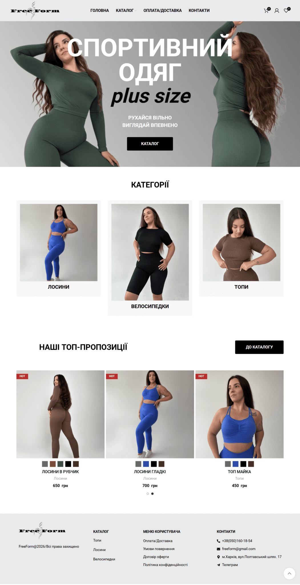 Проєктування структури: Створила зручну навігацію по категоріях (лосини, топи, велосипедки), щоб шлях до покупки був максимально коротким.